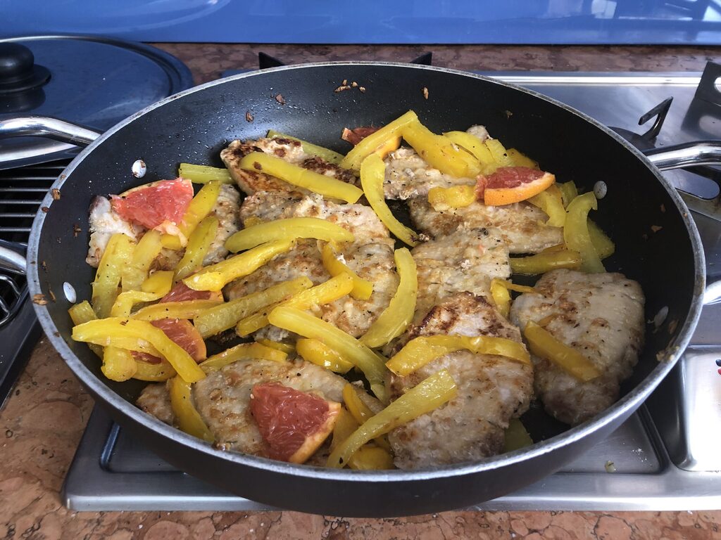 • Laisser le tout s’imprégner pendant quelques minutes à feu doux et ajuster le sel et le poivre à votre goût. Servir immédiatement les escalopes aux poivrons et pamplemousse, bien chaudes. Profitez-en ! Paola