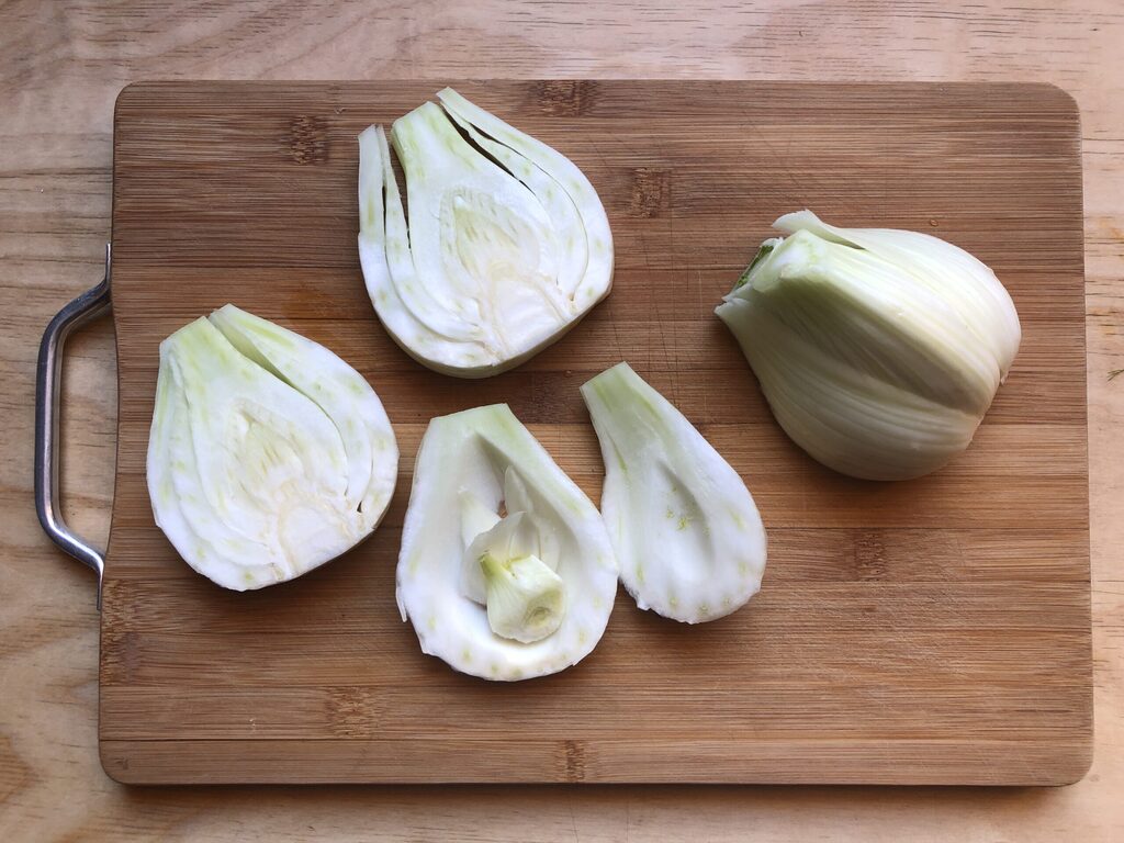 Retirer les tiges et une partie de la base des fenouils. Les laver, les sécher en les tamponnant avec du papier absorbant et les couper d’abord en deux dans le sens de la longueur, puis en tranches en essayant de les garder entières.