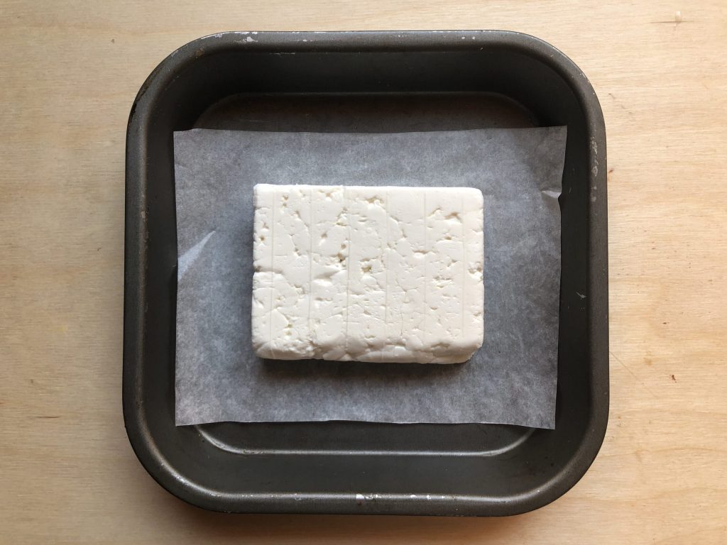 Mettre la feta dans un petit plat en la posant sur une feuille de papier sulfurisé.