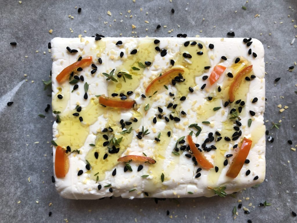 La parsemer de graines de sésame noir et d’ail en poudre. J‘ai essayé de les faire adhérer un peu sur chaque côté du fromage, même en dessous. Si vous n’avez pas de graines noires, vous pouvez utiliser le sésame blanc plus commun. La seule différence sera l’effet chromatique. Étant donné que la feta est blanche, le sésame noir convient nettement mieux. Si vous souhaitez acheter du sésame noir, vous pouvez le trouver en cliquant ICI.