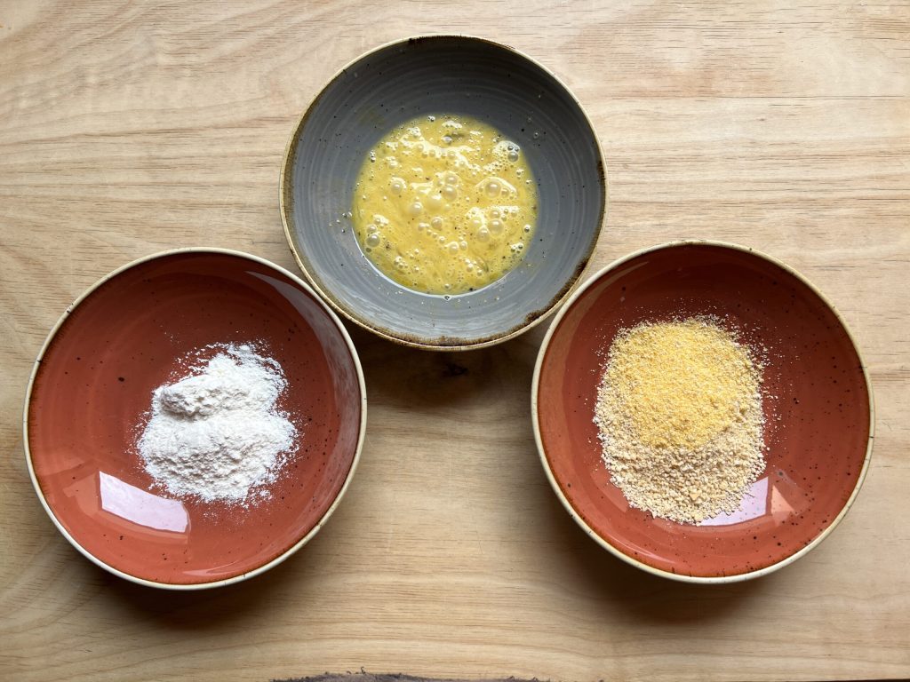 Préparez trois petites assiettes creuses : une avec la farine blanche, une avec l’œuf battu mélangé à une généreuse mouture de poivre noir, et une avec la chapelure et la farine de maïs fioretto. La proportion que j’ai utilisée pour ces deux derniers ingrédients était de 2:1. C’est-à-dire 2 cuillères à soupe de chapelure et une de farine de maïs.