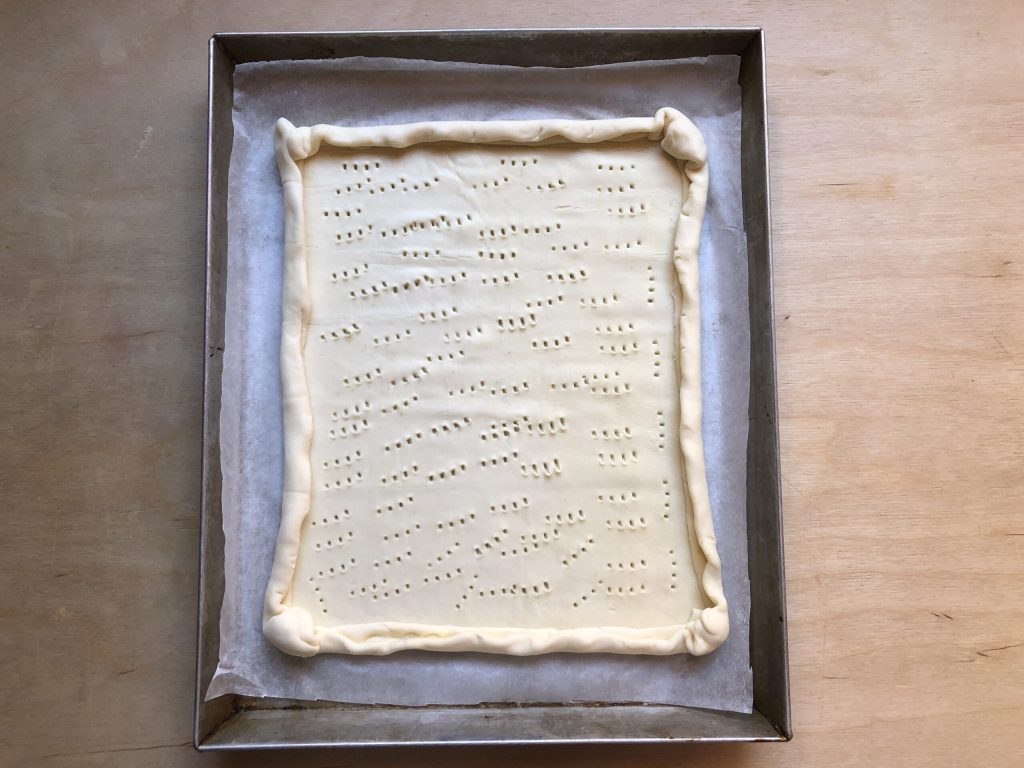 Transférer cette base à l’intérieur d’une plaque de cuisson et piquer tout le fond avec les dents d’une fourchette.