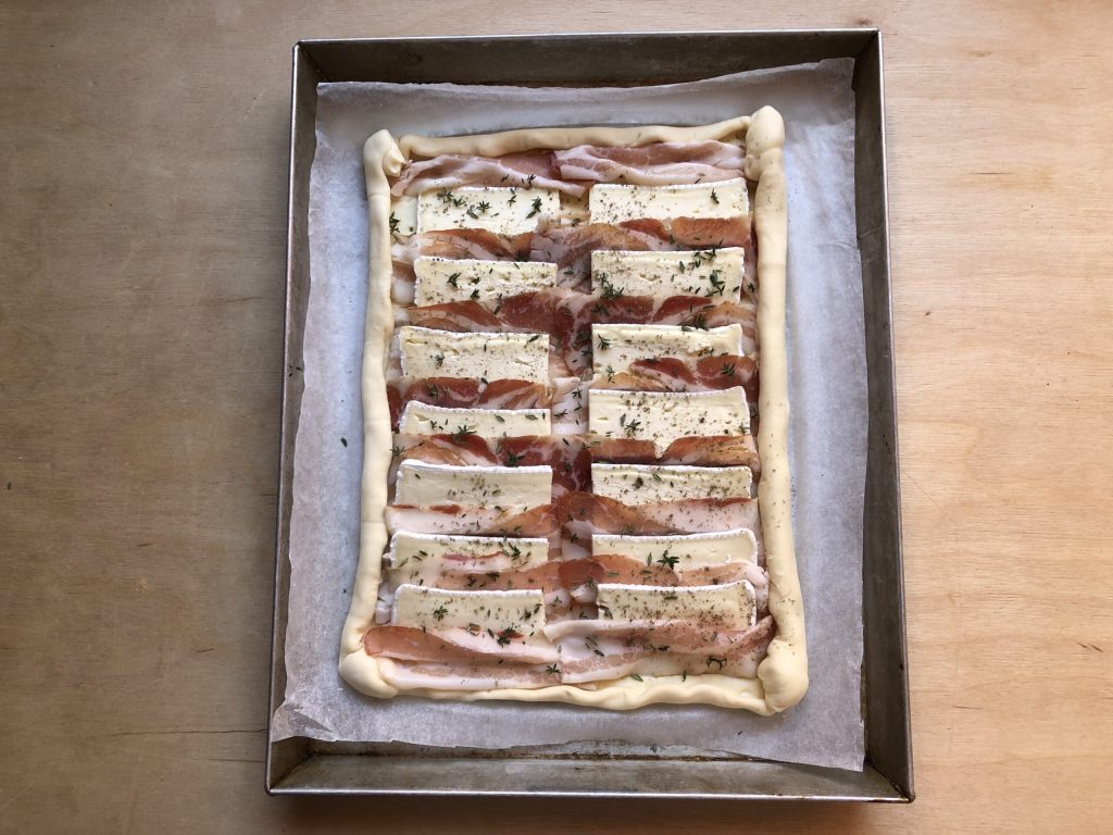 Couper le brie en fines tranches (si c’est trop mou, je vous conseille de le passer au congélateur pendant une dizaine de minutes) et couper en deux les tranches de bacon.