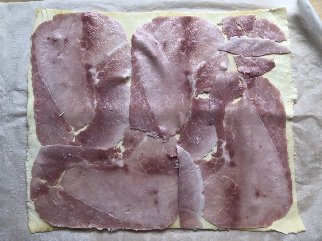 Ensuite, tournez le rectangle à l’envers (vous devez retrouver les graines de sésame en dessous qui serait ensuite la partie extérieure du rouleau) et faites une première couche avec les tranches de jambon cuit.