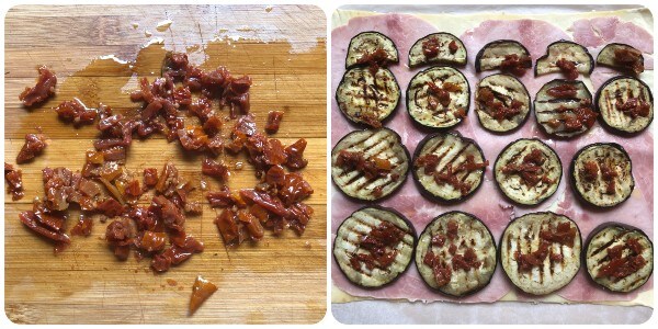 Égouttez les tomates séchées de l’huile de conservation et coupez-les en petits morceaux, puis répartissez-les sur les tranches d’aubergine.