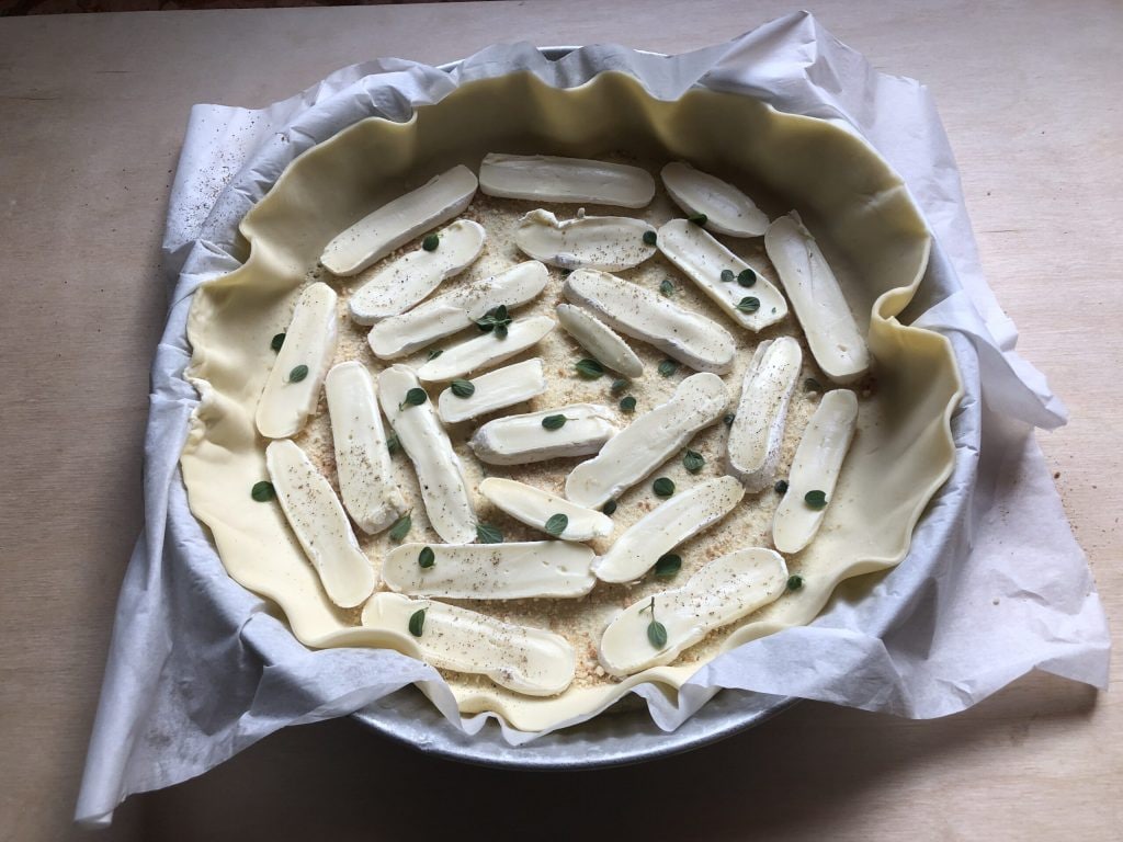 Pendant ce temps, dérouler le disque de pâte feuilletée et le disposer dans un moule en le gardant sur le papier sulfurisé fourni dans l’emballage. Piquer le fond avec les dents d’une fourchette et le saupoudrer de chapelure.