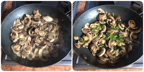Dans une poêle, chauffer quelques cuillères d’huile et faire revenir une gousse d’ail pelée et coupée en deux. La laisser grésiller un instant puis ajouter les champignons de Paris et les faire ramollir quelques minutes à feu vif en les remuant délicatement avec une cuillère en bois.
