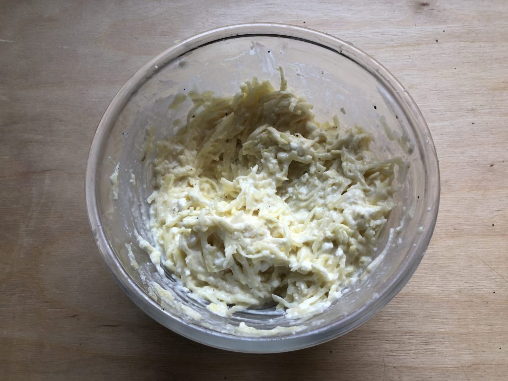 Éplucher les pommes de terre, les laver, les sécher en les tamponnant avec du papier absorbant et les râper avec une râpe à gros trous.