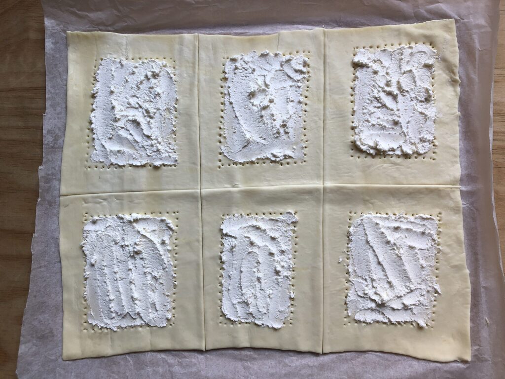 Dérouler le rectangle de pâte feuilletée, passer dessus délicatement avec le rouleau à pâtisserie puis le diviser en 6 rectangles et, avec les dents d’une fourchette, délimiter le périmètre de chaque feuilleté comme montré sur la photo.