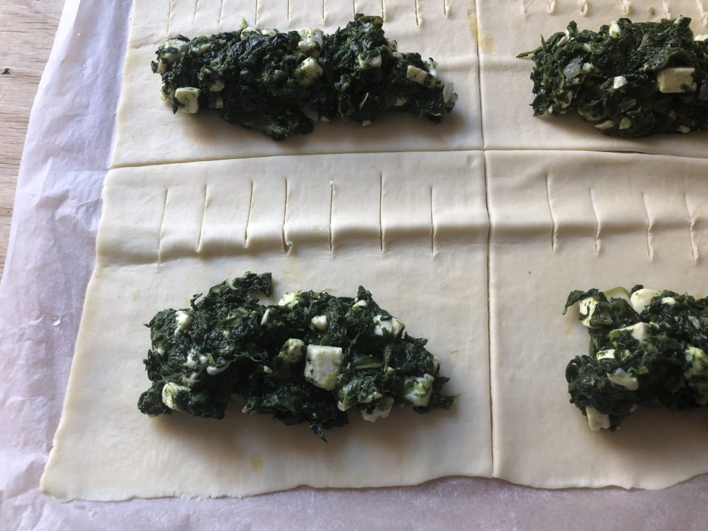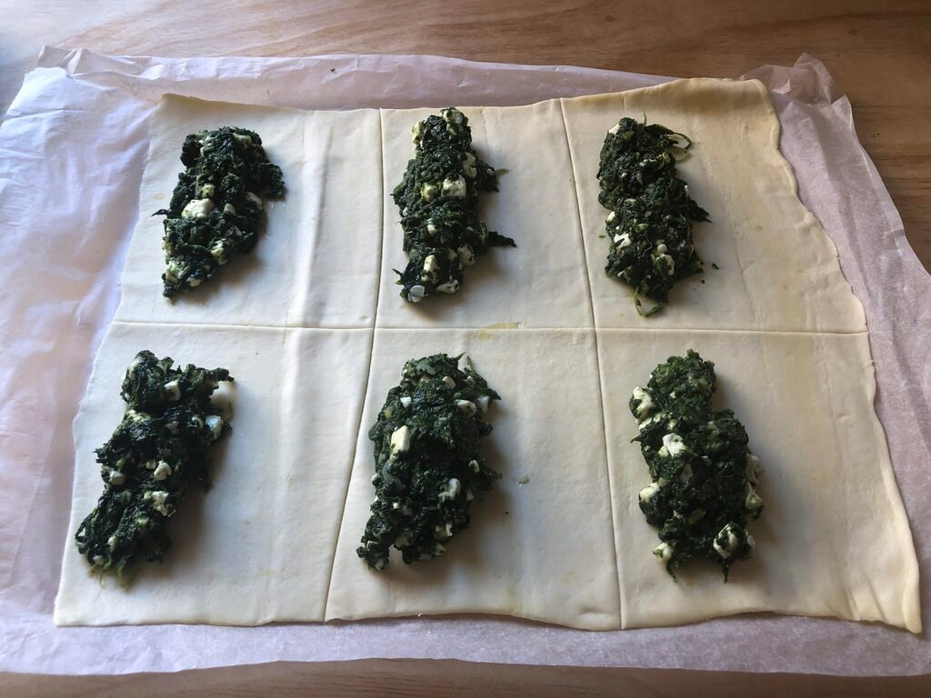 Distribuer un peu de garniture sur le côté long de chaque rectangle comme montré sur la photo. Essayez de bien répartir le mélange d’épinards en tenant compte du fait que vous devrez préparer 12 feuilletés.