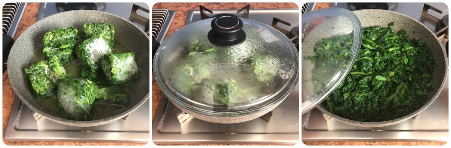 Dans une casserole, porter à ébullition un peu d’eau salée, puis ajouter les épinards encore surgelés et les cuire, avec le couvercle, jusqu’à ce qu’ils soient tendres. Il faudra environ 10 minutes.