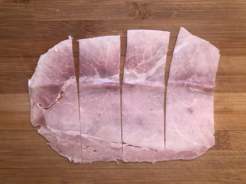 • Coupez les tranches de jambon cuit en bandes : chaque tranche donne environ quatre bandes.