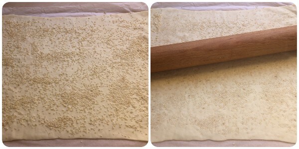 • Déroulez le rectangle de pâte feuilletée en le maintenant posé sur la feuille de papier sulfurisé fournie dans l’emballage, saupoudrez-le de graines de sésame et passez le rouleau à pâtisserie dessus pour les faire bien adhérer à la pâte.