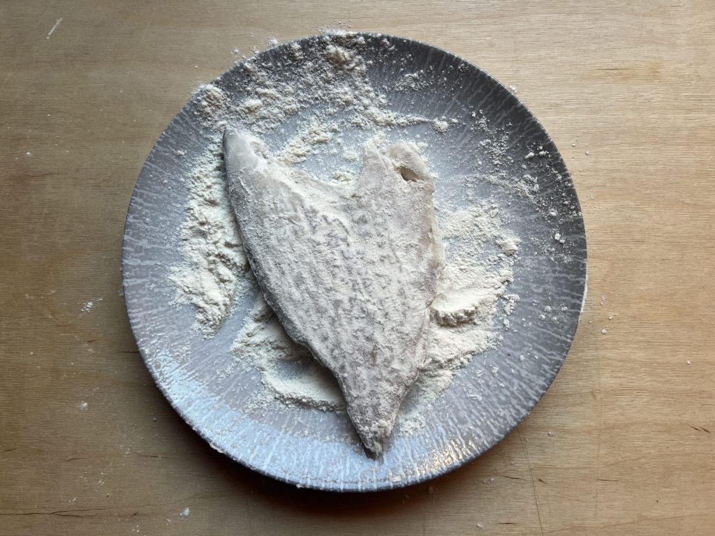 Fariner les filets de daurade des deux côtés. Si vous utilisez des filets de daurade surgelés, je vous conseille de les passer du congélateur au réfrigérateur la veille.