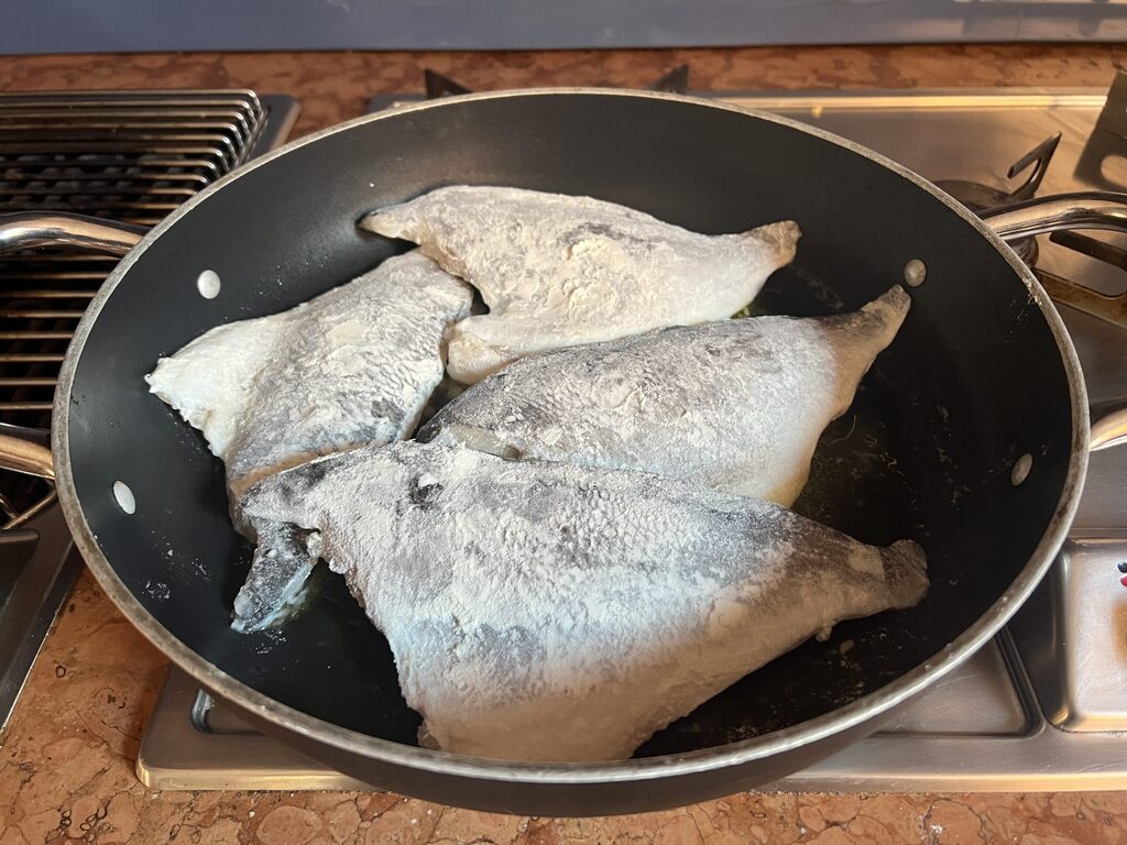 Ensuite, ajouter les filets de daurade en les plaçant dans la poêle, peau vers le haut, couvrir et cuire pendant 6/7 minutes à feu moyen-doux.
