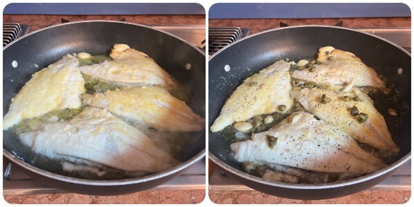 Retourner délicatement les filets de daurade avec une spatule, les saler et poivrer à votre goût et les arroser avec le jus de citron. Ajouter également les câpres, remettre le couvercle et poursuivre la cuisson pendant 5/6 minutes supplémentaires.