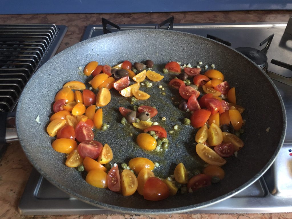 Le laisser frémir un instant puis ajouter les tomates cerises, les olives noires et les câpres et faire dorer le tout pendant quelques minutes à feu moyen-doux.