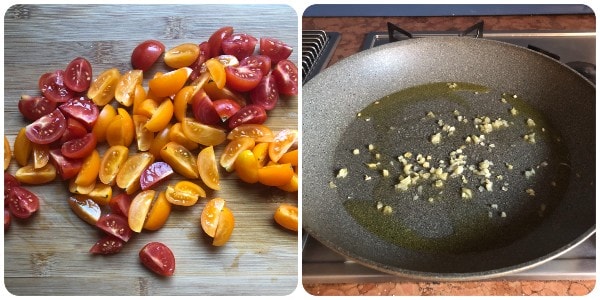 Laver les tomates cerises et les couper en quartiers. J’ai utilisé des tomates cerises rouges et jaunes mais vous pouvez aussi n’en utiliser qu’un seul type.