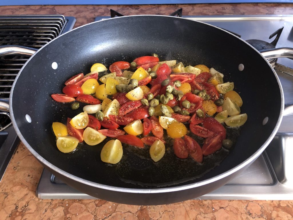 Laisser frémir quelques instants, puis ajouter les tomates cerises, les câpres préalablement dessalées sous l’eau courante, une bonne pincée de sel et une généreuse mouture de poivre noir.