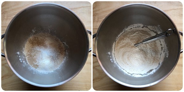 Mettre les deux farines dans le bol du robot pâtissier avec le sucre et la levure de bière sèche et mélanger avec un petit fouet manuel.