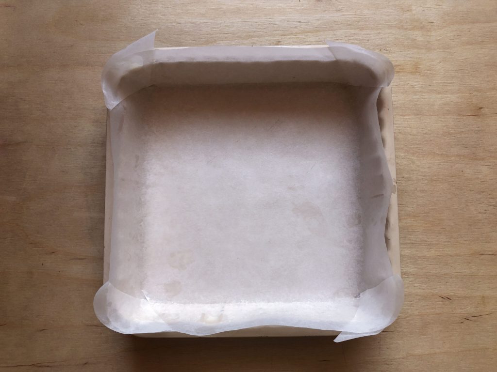 • Recouvrir de papier sulfurisé un moule carré de 22 cm.