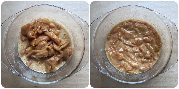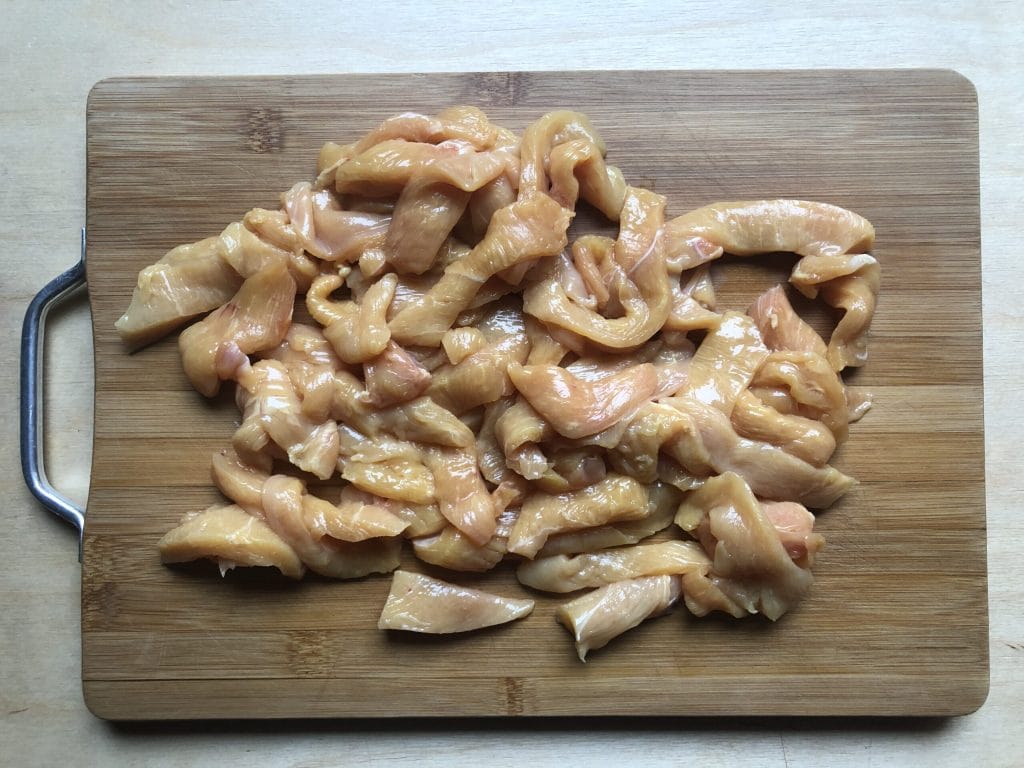 Enlever les éventuelles parties grasses des tranches de blanc de poulet et les couper en lanières.