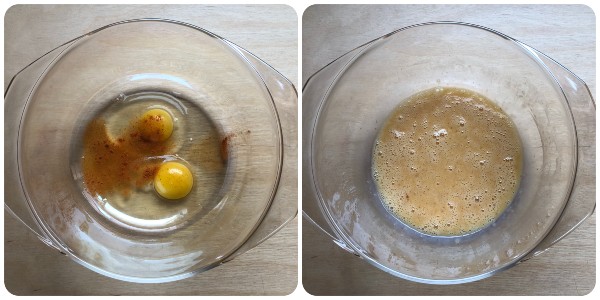 Dans un bol, casser les deux œufs, ajouter le Tandoori Masala (j’en ai mis un peu moins d’une cuillère à café) et une généreuse pincée de sel et battre avec un petit fouet à main juste assez pour mélanger les jaunes et les blancs.