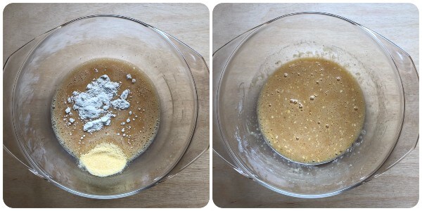 Puis, ajouter les deux farines et les incorporer parfaitement.