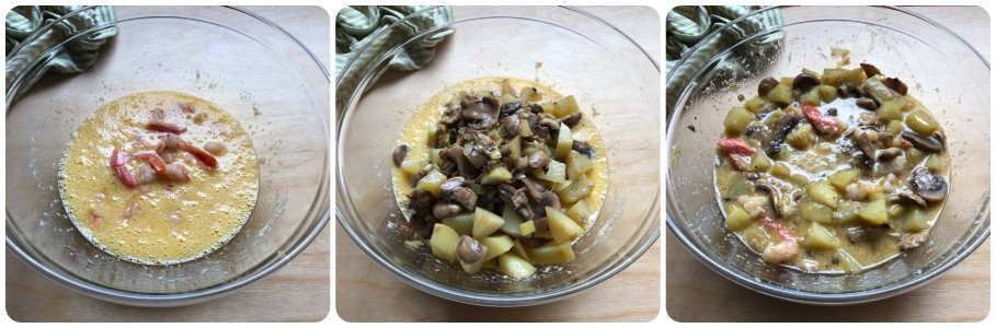 Incorporez maintenant les crevettes et le mélange poireaux, champignons et pommes de terre. Mélangez soigneusement pour bien amalgamer tous les ingrédients.
