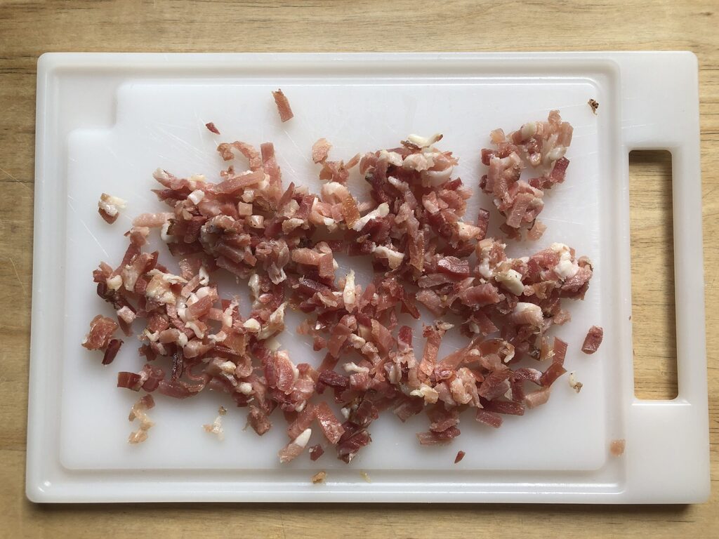 Couper les tranches de speck d’abord en lamelles puis en morceaux. Les mettre de côté.