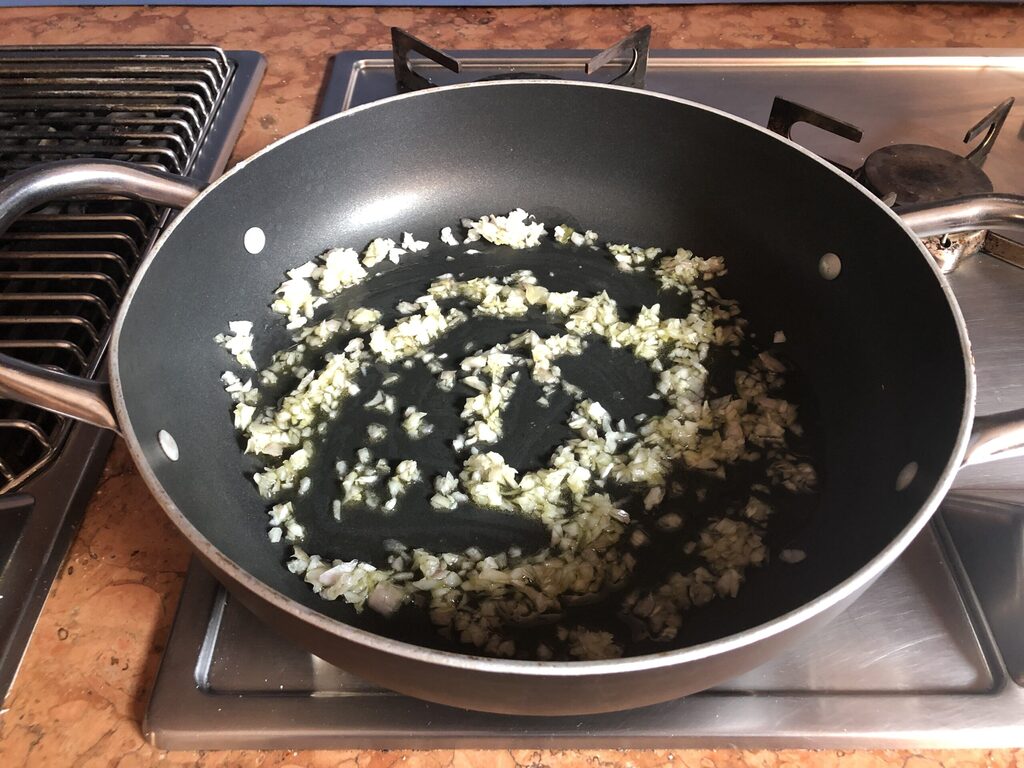 Dans une grande poêle, chauffer quelques cuillères à soupe d’huile avant d’ajouter l’échalote.