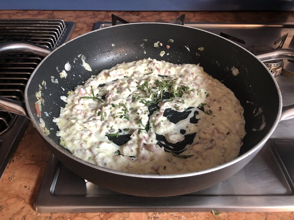Ensuite, ajouter le fromage frais et mélanger, en ajoutant aussi quelques cuillères à soupe d’eau de cuisson des fusilli pour bien diluer la sauce et la rendre crémeuse.
