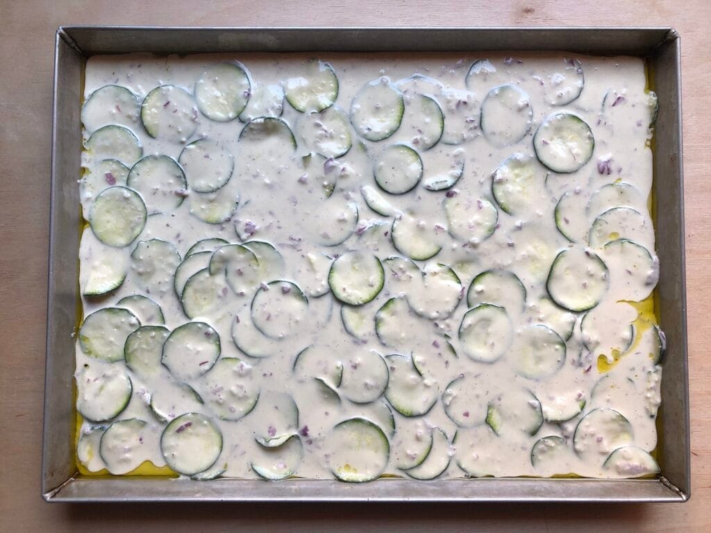 Bien chauffer une plaque de cuisson rectangulaire (la mienne mesure 27 x 34 cm) en la mettant dans le four lors de la mise en température. Ensuite, la graisser avec un peu d’huile et y verser le mélange de courgettes en essayant de le répartir uniformément.