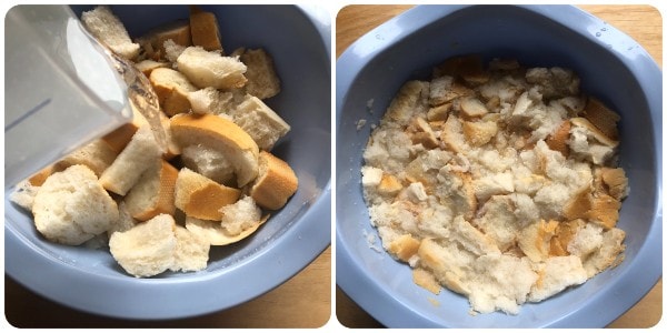 Coupez le pain rassis en morceaux grossiers, mettez-le dans un grand bol.