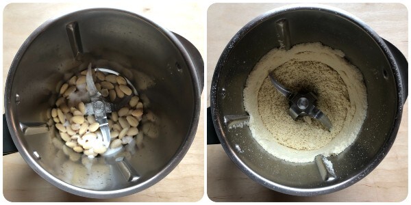 • Mettre dans un robot de cuisine les amandes, ajouter une cuillère à soupe de sucre prise du total et les hacher finement jusqu’à obtenir une poudre. J’ai utilisé le Thermomix en mixant pendant 15 secondes à vitesse 7.