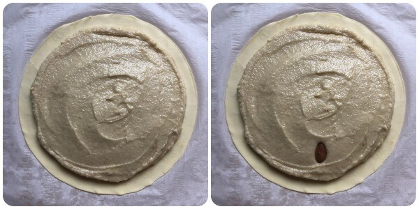 • Verser cette crème au centre du disque de pâte plus petit et l’étaler avec la spatule en laissant librement un couple de centimètres de bordure. N’oubliez pas de placer dans la pâte l’amande entière. J’en ai mis une non pelée.