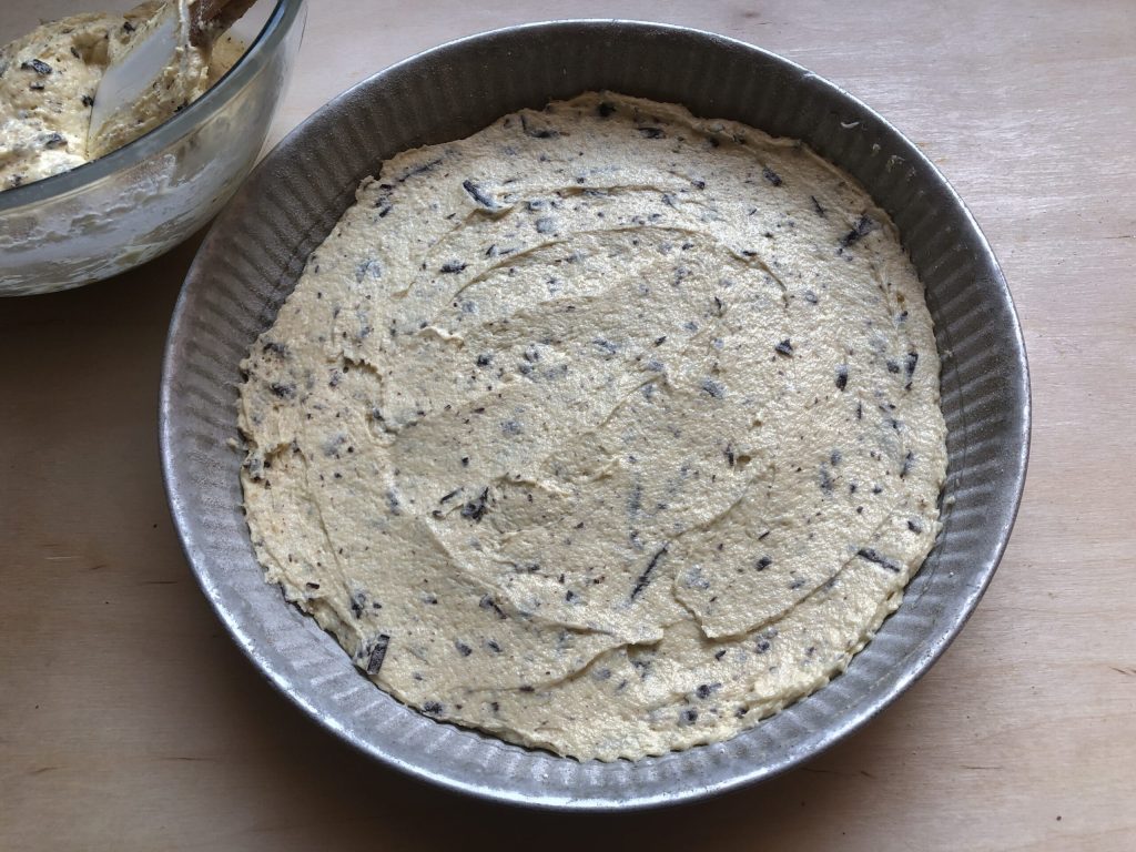 Maintenant, verser la moitié du mélange dans un moule de 26 cm de diamètre préalablement beurré et fariné et bien le niveler.
