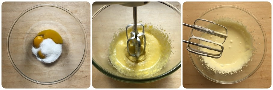 Ajoutez les 50 g de sucre restants aux jaunes d’œufs et travaillez-les aussi avec les fouets jusqu’à ce qu’ils deviennent clairs et mousseux.