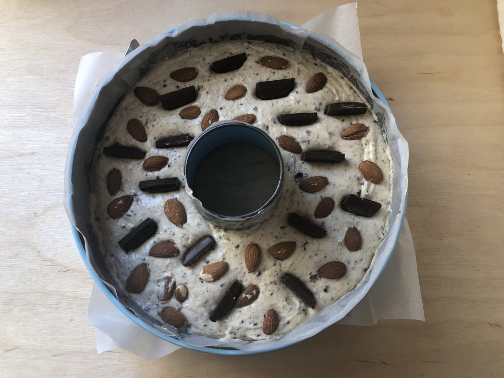À ce stade, enfoncer dans la pâte les carrés de chocolat de la tablette et disposer les amandes entières sur la surface.