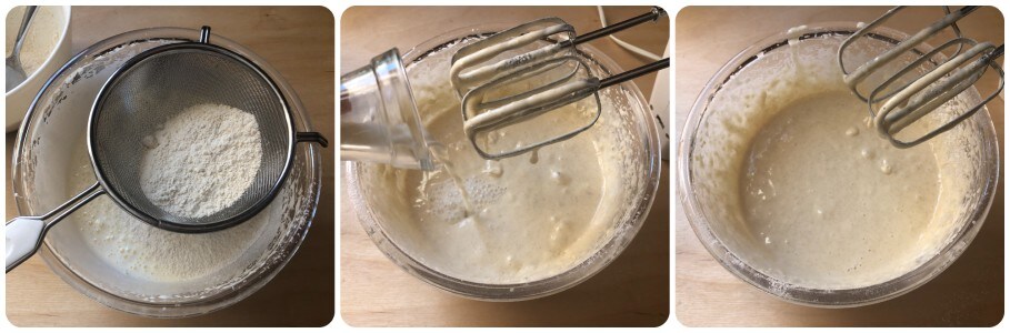 Commencer à ajouter au mélange la farine type 1 et la vanilline en les tamisant à travers une passoire à mailles fines et en alternant avec le lait. Travaillez toujours avec les fouets électriques.