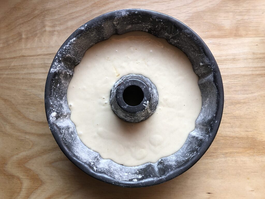 Beurrer et fariner un moule à gâteau de 24 cm de diamètre et y verser la moitié de la pâte.