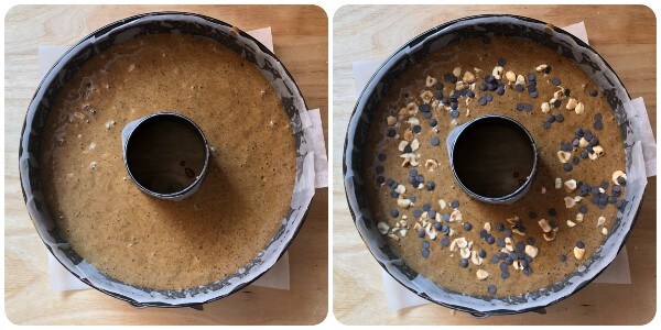 Versez la pâte obtenue dans le moule préalablement préparé et égalisez, puis répartissez sur la surface les noisettes réservées et une cuillère de pépites de chocolat.