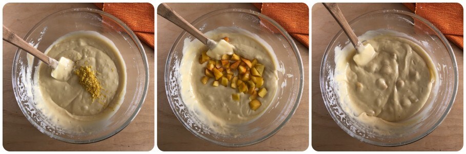 Ensuite, ajouter également le zeste de citron et un tiers des morceaux de pêche et donner un dernier mélange.