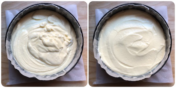 Verser la préparation (qui est très liquide) dans un moule à charnière de 24 cm de diamètre préalablement tapissé de papier sulfurisé. Bien niveler.