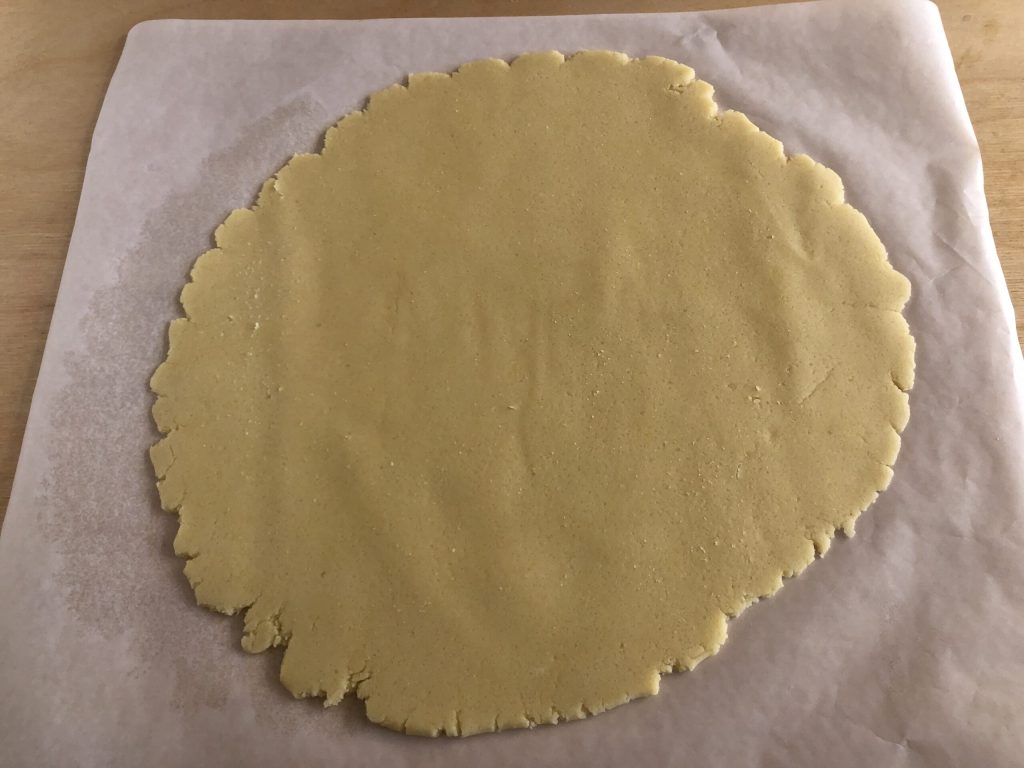 Reprendre la pâte sablée et l’étaler avec le rouleau sur une feuille de papier sulfurisé en essayant de former un cercle d’environ 30 cm de diamètre.