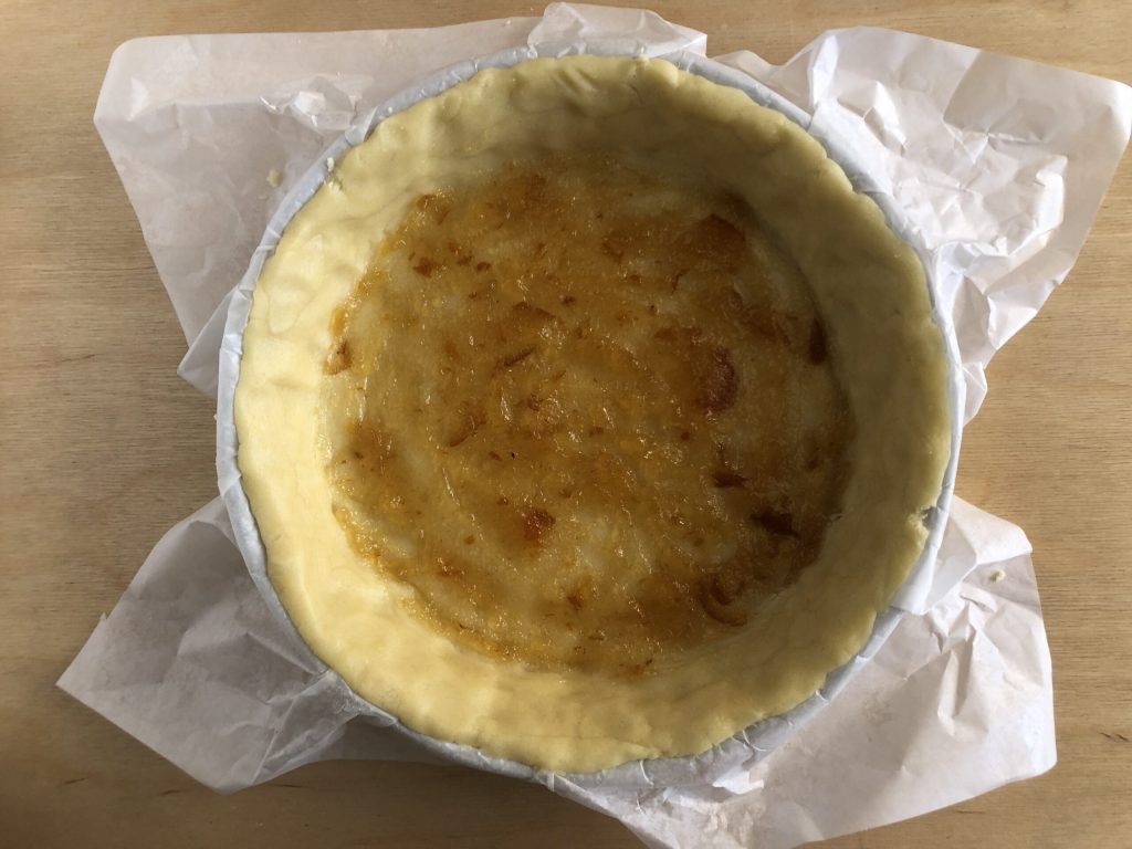Transférer le disque de sablée dans un moule de 24/26 cm de diamètre en le gardant sur le papier sulfurisé et couvrir également tout le bord.