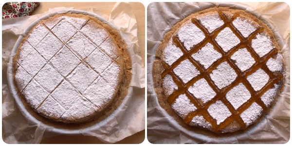 Une fois le temps de cuisson écoulé, retirer le gâteau Cremona du four et, avec la seringue, tracer des losanges de confiture en suivant les lignes précédemment marquées.