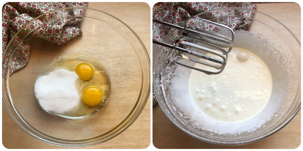 Mettre dans un deuxième saladier les œufs avec le sucre et les travailler longuement avec les fouets électriques jusqu’à obtenir un mélange clair et mousseux.
