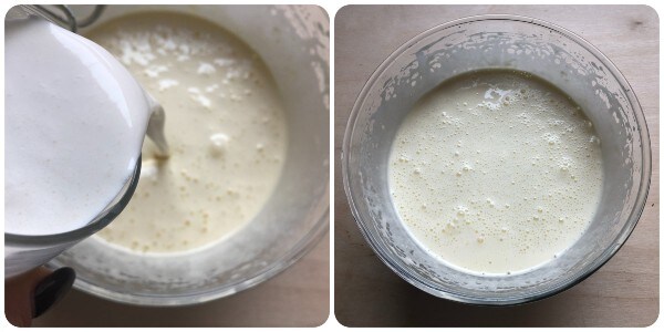 Ajouter progressivement ce mélange au mélange d’œufs et de crème en le tamisant à travers une passoire à mailles fines et l’incorporer avec une spatule.