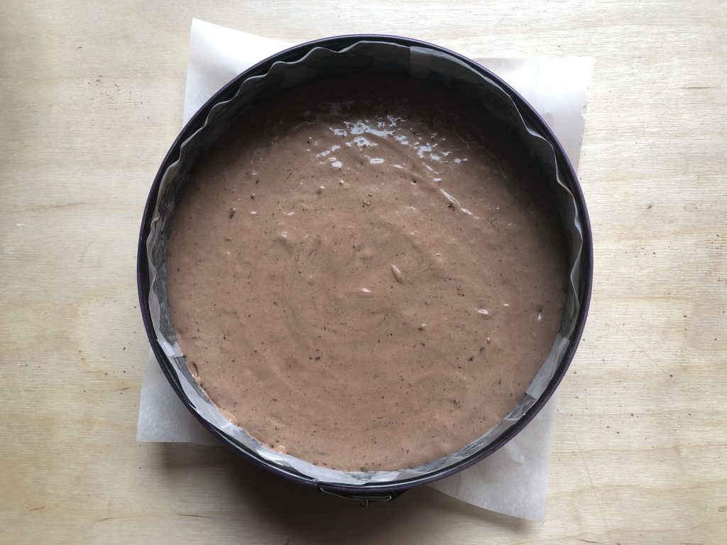 À ce stade, verser la pâte obtenue dans un moule à charnière de 20 cm de diamètre préalablement tapissé de papier sulfurisé et l’égaliser avec la spatule.